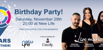 New Life is celebrating its 9th anniversary, and we invite you to join us for a special birthday party with live music by Michaela Theodorou, Make Antoniou & Nikolas Pattouras! Enjoy the evening with delicious bites and unlimited drinks, in a vibrant atmosphere full of fun and great music. Start Time: 20:00  The event will take place in the large group training […]